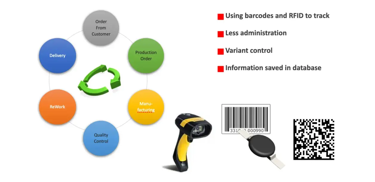 We capture and transfer critical data from each individual product in production to your ERP system or a dedicated database. This provides complete traceability and guarantees high-quality standards. You gain insight into every aspect of the process, including the components and materials used, the production steps followed, the equipment and personnel involved, precise timestamps, and more.